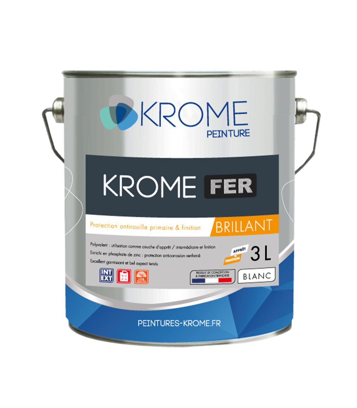 Constitue une protection définitive sur acier, le KROME FER doit être appliqué en 2 couches.